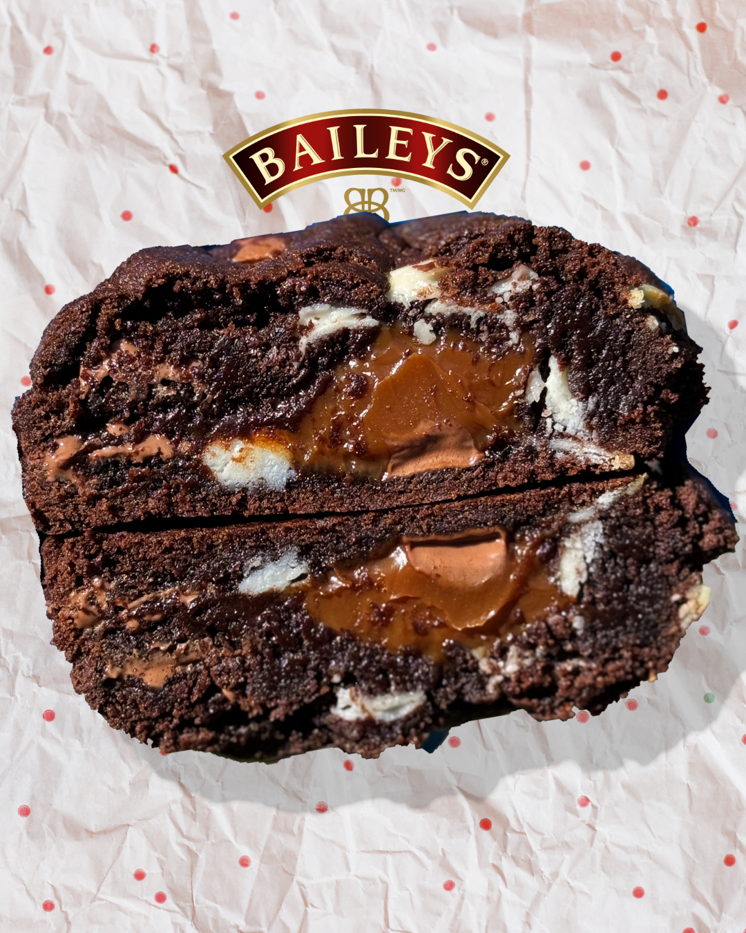 azúcar blanca, azúzcar morena, baileys original, bicarbonato de sodio, cacao, chocolate belga, chocolate blanco, huevo, dulce leche, polvo de hornear, sal.